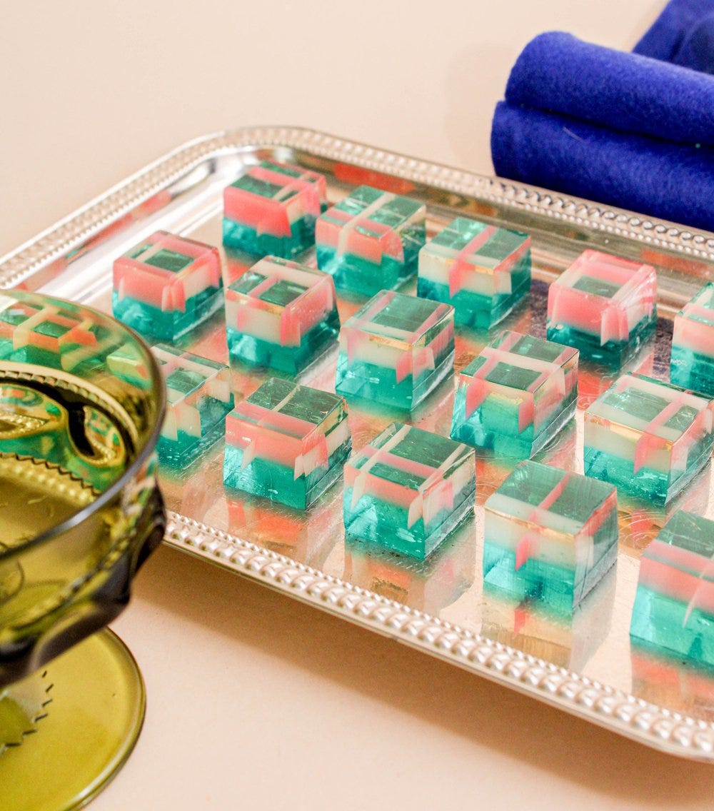Call me crazy, but I think jello might be the amuse-bouche du jour? Two recent events I attended were serving jello shots: one had the familiar assortment of technicolor grape/cherry/lime flavors, but the other was dishing up turquoise squares shot through with bolts of cream and pink — apparently they were French 75-flavored, and went down smooth as silk. When I inquired as to their provenance, I was pointed towards Brooklyn-based Solid Wiggles, which cooks up fun, abstract, cocktail-flavored jelly shots and cakes that are little works of art unto themselves. Most of their orders are in NYC, but if you simply must get your hands on their boozy bites, they also offer nationwide shipping via Goldbelly.